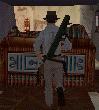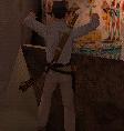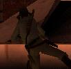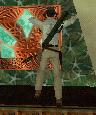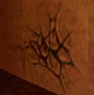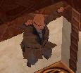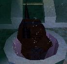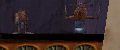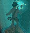 zwei komische Statuen. Geh zu der linken. Die Wand daneben sieht