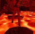 Dreh Dich wieder dem Lava-See zu. Vor Dir tauchen regelmässig zwei Platten auf. Spring auf die linke davon.