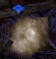ein Loch in die Mauer, direkt vor einem blauen Kristall.