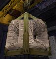 Kran hebt den verpackten Kristall in die Höhe.