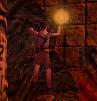 dem Gang, begleitet von Fackeln, die sich selbst entzünden.